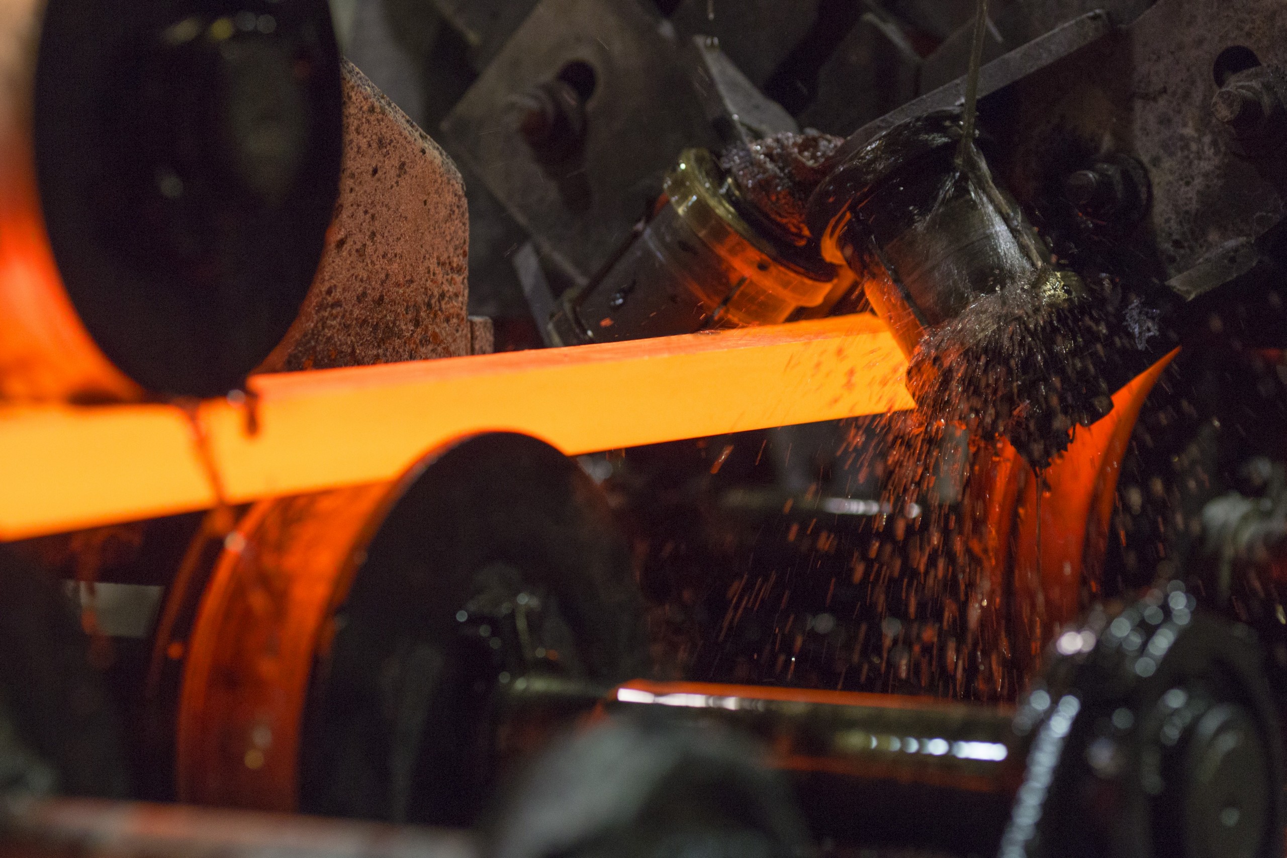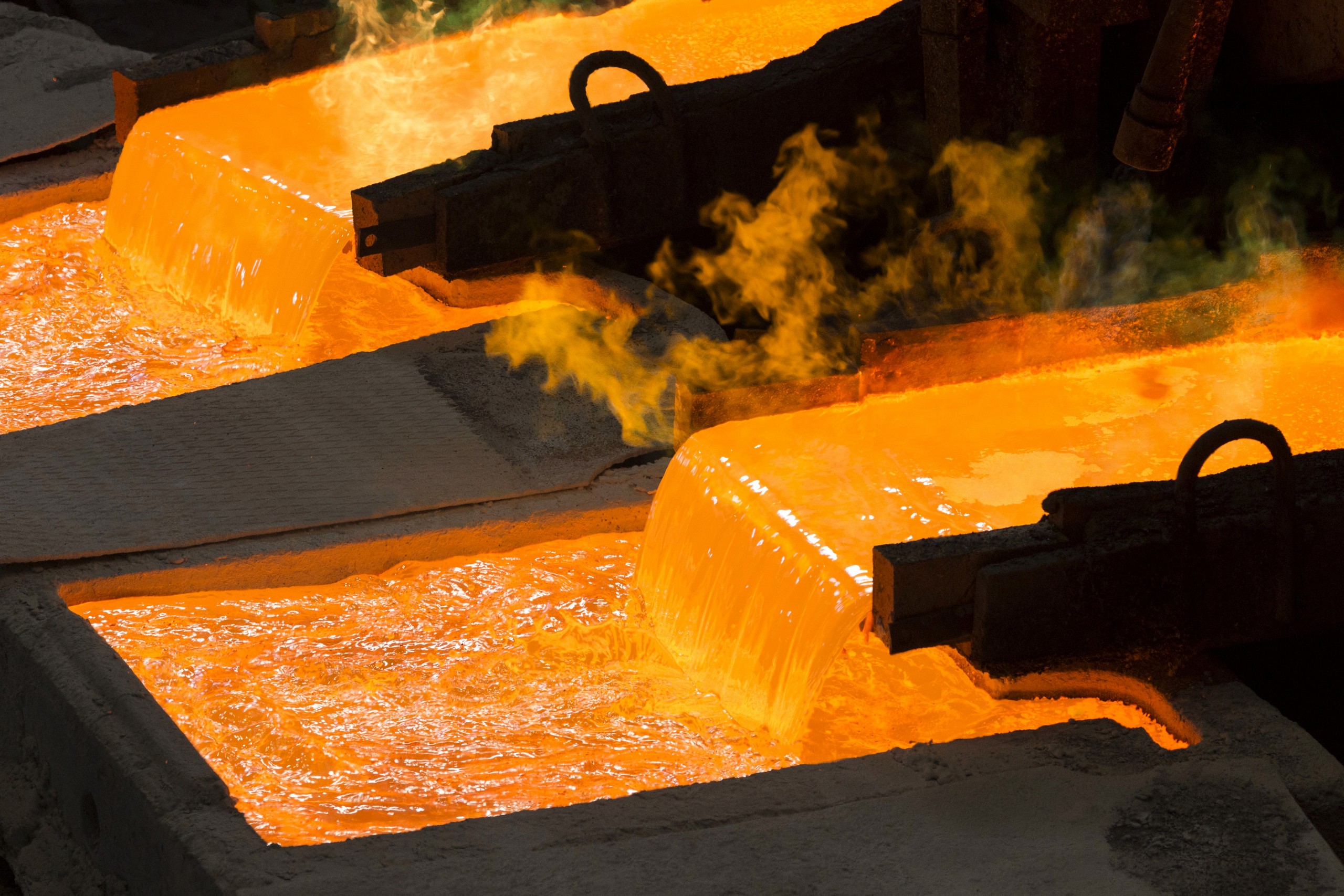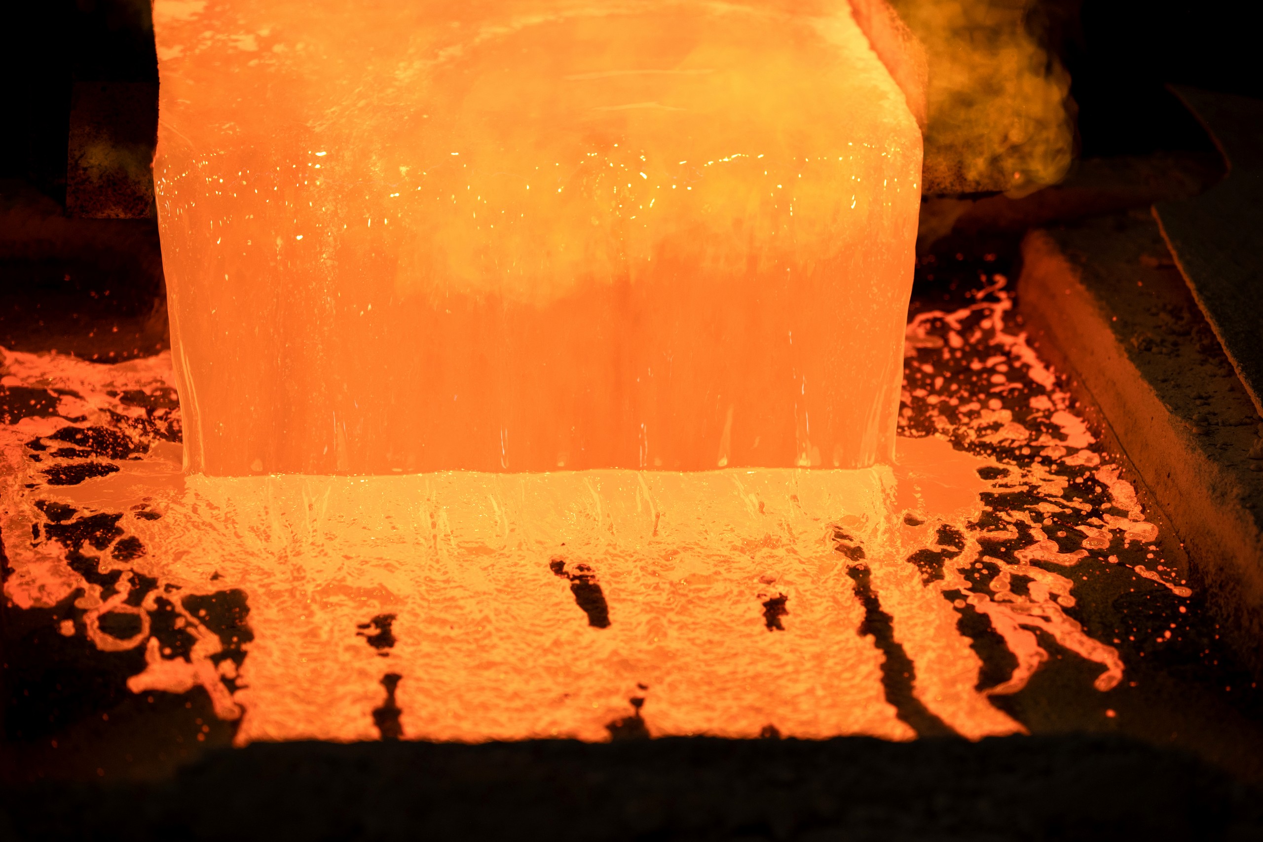 За время полного оборота медь немного затвердевает и её перемещают в ванную для охлаждения. Так получают большие медные пластины - аноды. Металл в них еще не очищенный, грубый, но именно из него чуть позже в соседнем цехе получают высококачественную медь.
